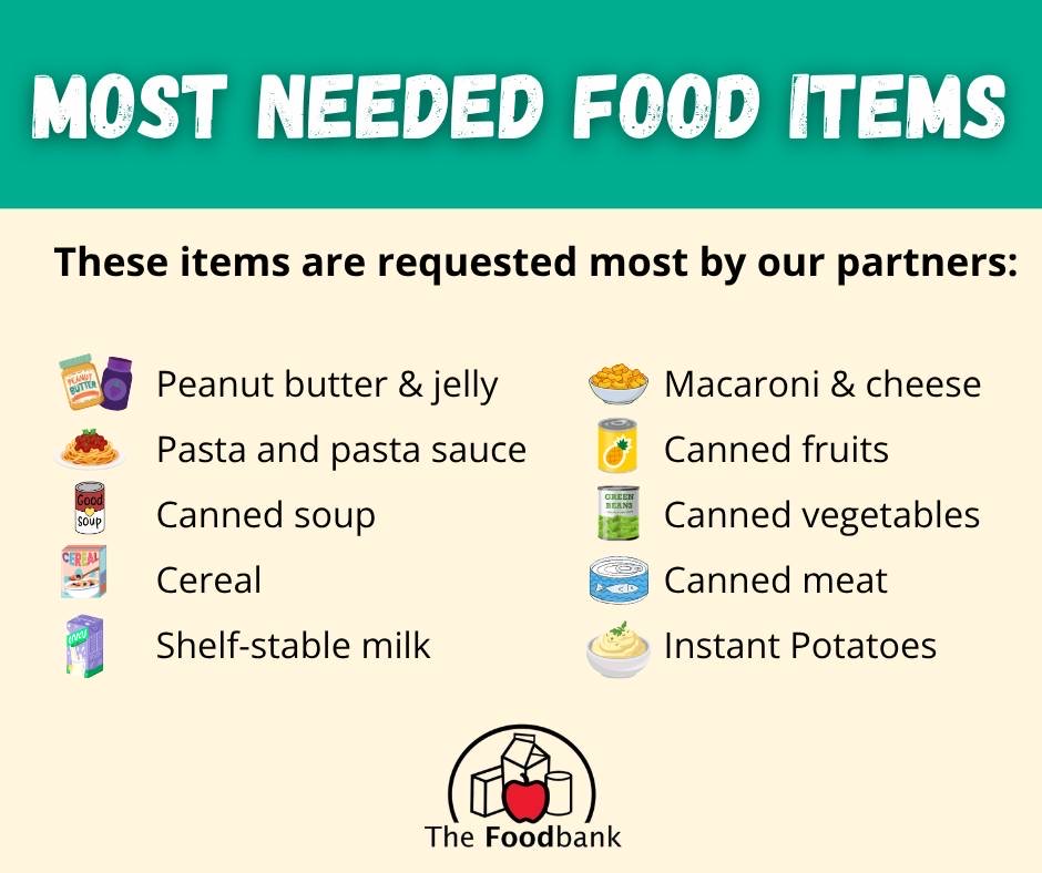 - Bring two or more non-perishable items from the food banks’ “most-needed” lists (see below)